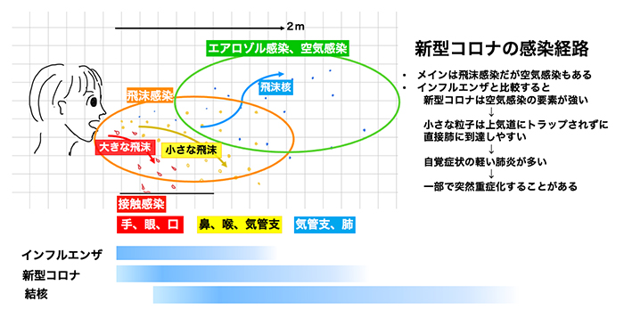 当初はインフルエンザと同様に接触感染、飛沫感染がメインと考えられていましたが、現在は、さらに小さな微粒子(マイクロ飛沫、エアロゾル、飛沫核などと呼ばれます)による空気感染の要素がインフルエンザよりも強く重要な感染経路と考えられています。さらに空気感染の方がメインだという報告も出てきています。肺炎なのに喉や気管支の症状が軽く突然重症化する人がいるのも空気感染によりウイルスが直接肺に到達するためと考えられます。しかし、空気感染だからと言って、対策はこれまでと大きくは変わりません。空気感染源になるような小さな微粒子も口から出る時は水分を含んだ唾液飛沫で、不織布マスクならかなり防ぐことができるからです。マスクの隙間から漏れるような最初から小さなものはほとんどが呼気の水蒸気でウイルスはあまり含んでいません。但し、ウレタンマスクは大きな飛沫も通してしまうことがわかっています。マスク不足が解消された現在はできるだけ不織布マスク(使い捨てマスク)を着用して下さい。
