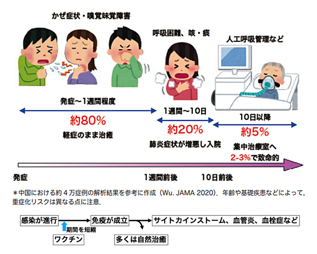 初期は無症状や風邪症状など軽い症状で感染が進行しますが、自然に免疫が成立し、8割は1週間程度で自然治癒します。しかし、一部は免疫の暴走や呼吸不全、血栓症により重症化し、人工呼吸管理に至ります。ワクチンには免疫の獲得を早めて重症化を防ぐ効果が期待できます。
